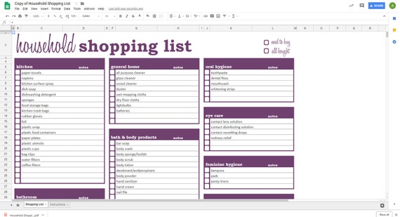 Household Shopping List Google Sheets Template Editable Printable Household Supplies Checklist Instant Digital Download