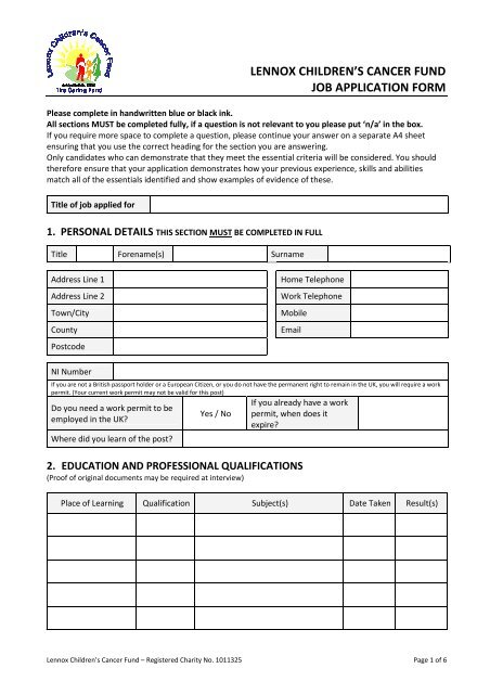 Job Application Form Pdf Lennox Children S Cancer Fund