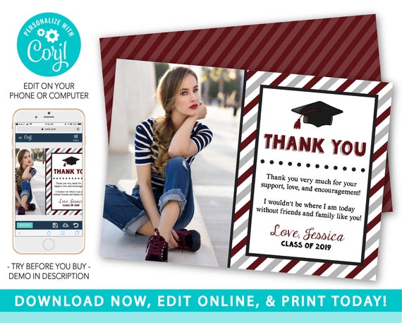Graduation Thank You Card With Photo In Maroon Editable