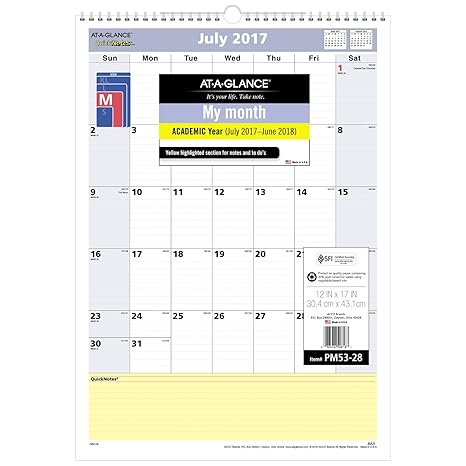 At A Glance Academic Wall Calendar Quicknotes July 2017