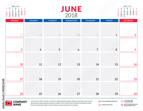 June 2018 Calendar Planner Vector Illustration Stock Vector