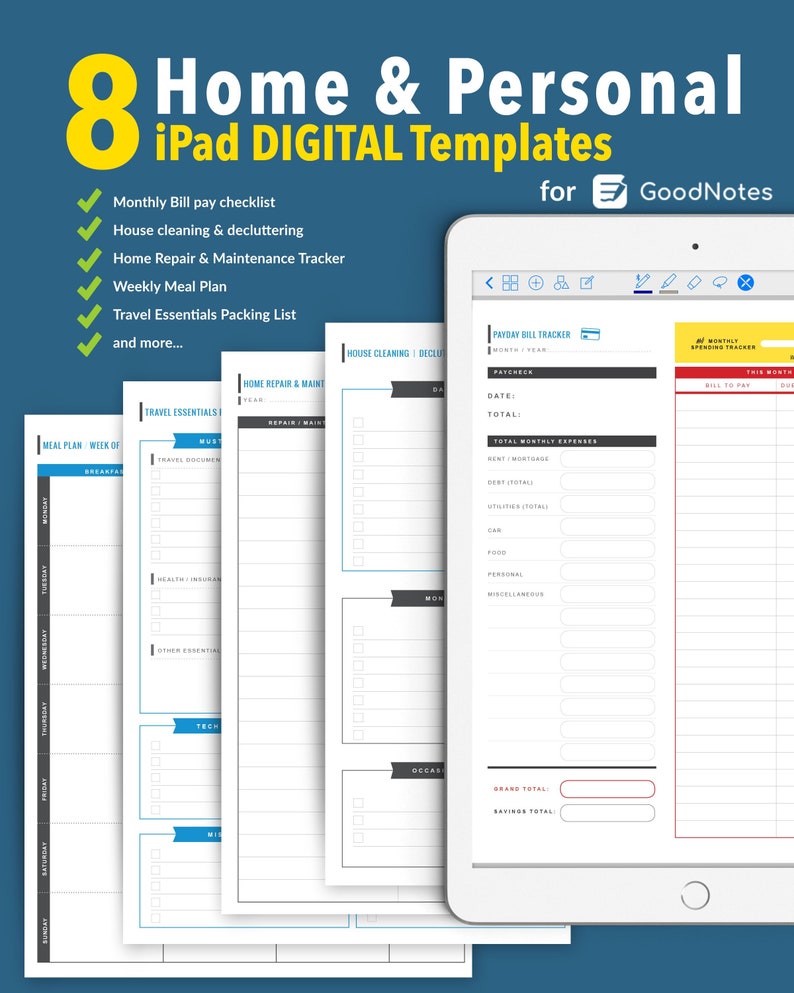 Home Personal Digital Templates Goodnotes Home Repair Tracker House Cleaning Bills Trackers Meals Shopping List Packing Lists