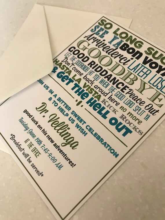 Leaving party invitation template. The below series of going away party invitation wording ideas are great samples to the types of messages that can be used when planning this special event. Check out more blogs for advice on how to spruce up your invitation templates. Some ideas you can try for your party invitation templates include making rustic farewell invitations using burlap and lace spreading elements on a blank template like petals or applying a different texture on your invite like a stain glass texture.
