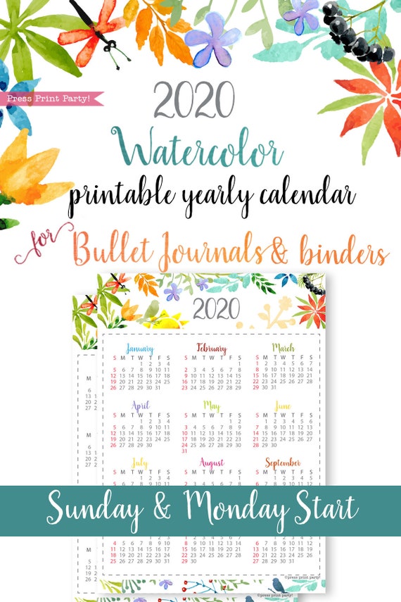 2020 Calendar Template Printable Watercolor Bullet Journal