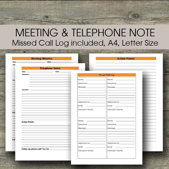 Meeting Minutes Printable Office Planner Bundle A4 Letter Action Points Missed Calls Log Telephone Messages Meeting Notes