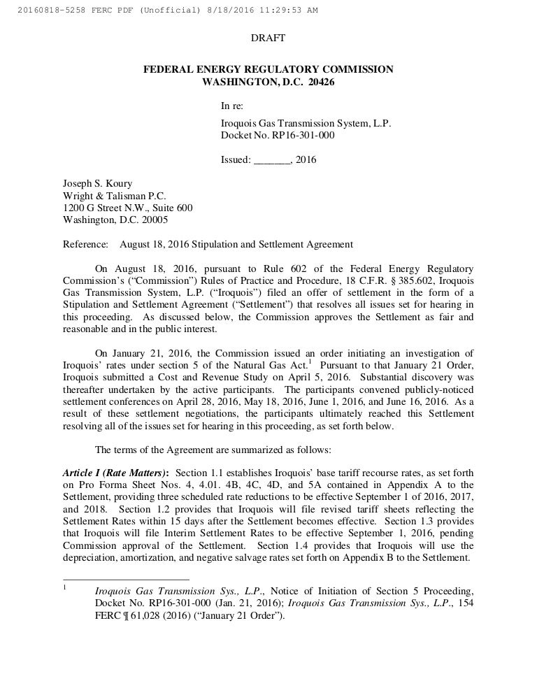 Iroquois Gas Transmission Proposed Rate Settlement Agreement