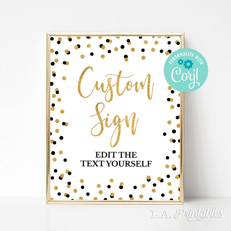 Editable Party Sign Template Black Gold Glitter Confetti Custom Shower Sign Birthday Sign 2 Sizes Corjl Make Up To 10 Signs